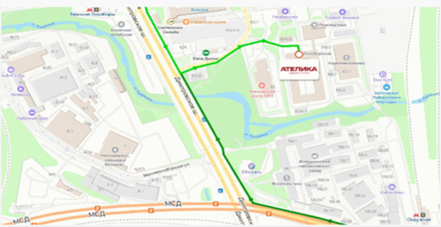 выход 4, 100 метров через дорогу до перехода через Дмитровское шоссе, после перехода повернуть направо,следовать прямо вдоль Дмитровского шоссе порядка 250 метров, повернуть налево и идти прямо порядка 300 метров до входа в БЦ «Лихоборский».